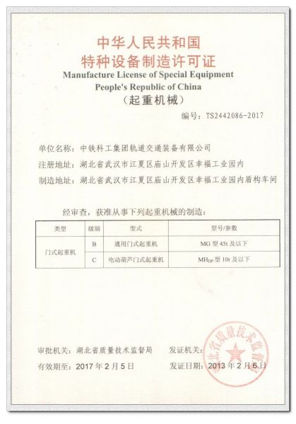 | 中華人民共和國特種設備制造許可證門式起重機C級 |