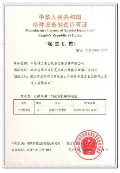 中華人民共和國(guó)特種設(shè)備制造許可證門(mén)式起重機(jī)A級(jí)