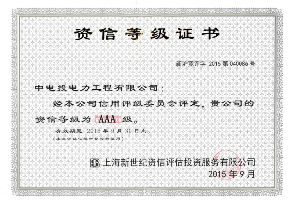 公司擁有電力工程總承包一級、對外工程承包經(jīng)營一級、監(jiān)理甲級、調(diào)試甲級、設(shè)計乙級和工程咨詢、招標(biāo)代理等資質(zhì),是國家“高新技術(shù)企業(yè)”、“標(biāo)準(zhǔn)化良好行為AAAA級”企業(yè)、電力行業(yè)“AAA”級信用企業(yè),獲得了國家和國際權(quán)威機構(gòu)頒發(fā)的質(zhì)量管理體系、職業(yè)健康安全管理體系、環(huán)境管理體系三項認(rèn)證。