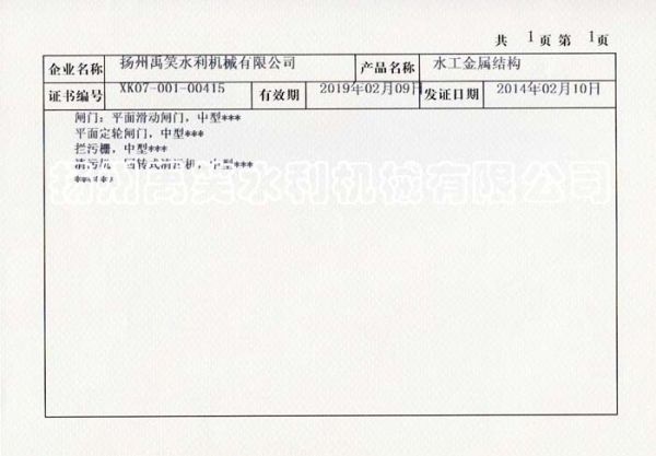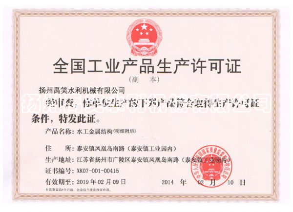 揚(yáng)州禹笑水利機(jī)械有限公司座落于文化積淀深厚,風(fēng)景秀麗的古城揚(yáng)州。本公司產(chǎn)品主要產(chǎn)品有:卷?yè)P(yáng)式啟閉機(jī)、螺桿式啟閉機(jī)、液壓?jiǎn)㈤]機(jī)、鋼(鑄鐵)閘門(mén)、龍頭閘門(mén)、拍門(mén)、攔污柵、清污機(jī)螺旋壓榨機(jī)、皮帶輸送機(jī)等一系列產(chǎn)品,規(guī)格齊全。